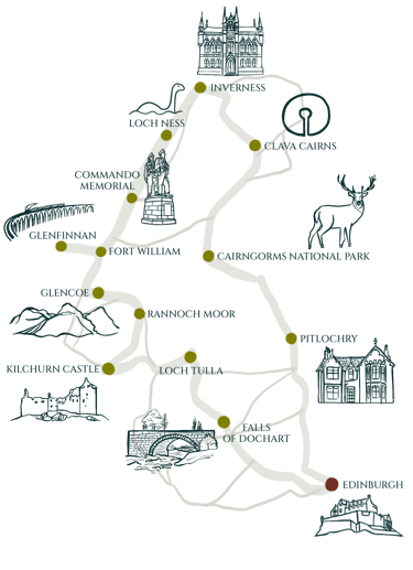 Después del crucero, nuestro guía lo guiará en una exploración de un sitio arqueológico de 4000 años de antigüedad: Clava Cairns. Este paisaje ha sido un lugar importante para las actividades rituales y funerarias desde al menos la Edad del Bronce. Atravesando el Parque Nacional del Cairngorms, nuestro recorrido finalizará en Pitlochry, un pintoresco pueblo victoriano con un ambiente único, donde podrá disfrutar de un trago del whisky local y algo de comida tradicional escocesa.