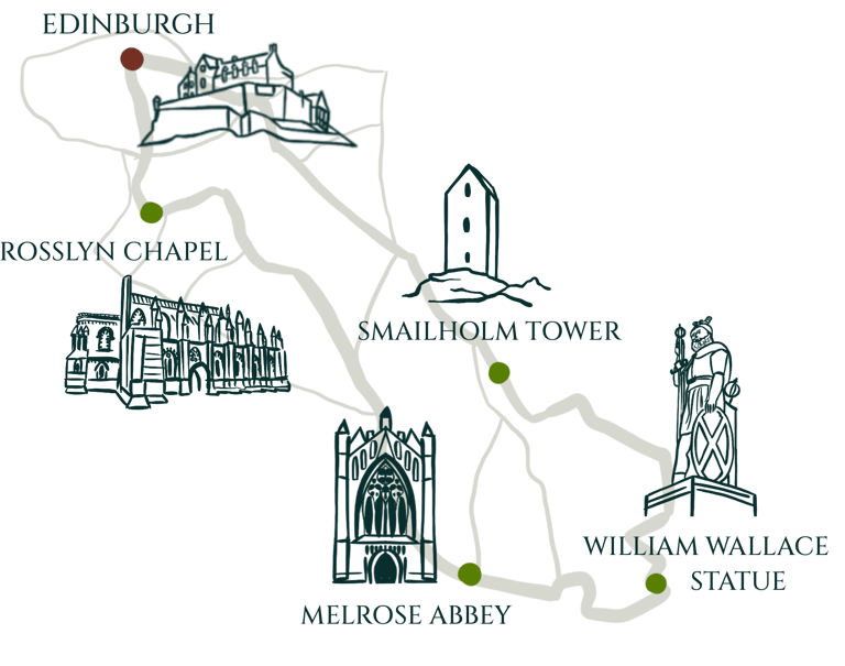 Te llevaremos a algunos de los sitios más icónicos y misteriosos de la región, incluida la Torre de Smailholm, una torre del siglo XV relacionada con la infancia de Sir Walter Scott. También verás una estatua escondida de William Wallace, el héroe escocés del siglo XIII, y explorarás Melrose Abbey, un monasterio en ruinas fundado en 1136. Finalmente, visitarás la Capilla de Rosslyn, un edificio misterioso y fascinante lleno de tallas intrincadas y símbolos. En el camino, te contaremos historias sobre las personas que vivieron en estos lugares y los eventos que tuvieron lugar allí.