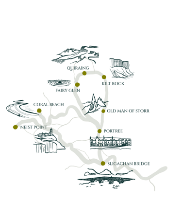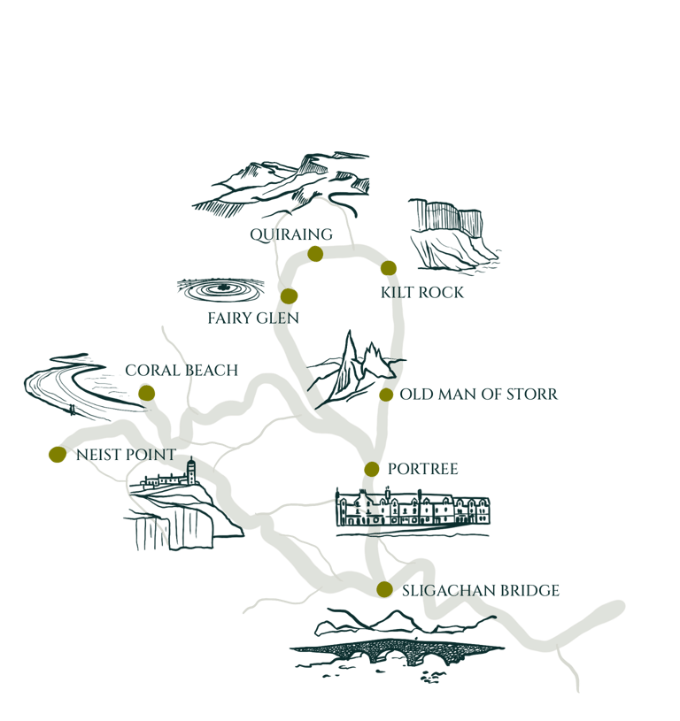 La nostra esplorazione inizierà con l'Old Man of Storr, una enigmatica formazione rocciosa con ampie vedute del paesaggio circostante, le cui origini misteriose sono avvolte in leggenda. Da lì, una strada panoramica lungo la costa ci porterà a Kilt Rock, un'imponente scogliera le cui colonne di basalto ricordano il kilt. Il viaggio proseguirà con una sosta al passo di montagna del Quiraing. Le parole non riescono a descrivere il paesaggio magico che potrai ammirare una volta raggiunta la cima del passo, dove le spettacolari pareti rocciose e valli nascoste ti toglieranno il fiato. Il Quiraing ha ispirato innumerevoli registi, tra cui Ridley Scott (Prometheus) e Lars Von Trier (Breaking the Waves). Prima di lasciare il Trotternish, ci sarà ancora tempo per un'ultima meraviglia, forse la più mistica di tutte: Fairy Glen. La valle delle fate è un paesaggio nascosto fatto di colline erbose e laghi in miniatura, che ti fanno chiedere se Tolkien non lo avesse a mente quando descriveva la Terra di Mezzo. Qui, come a Quiraing, avrai l'opportunità di camminare al tuo ritmo ed esplorare questa meraviglia.