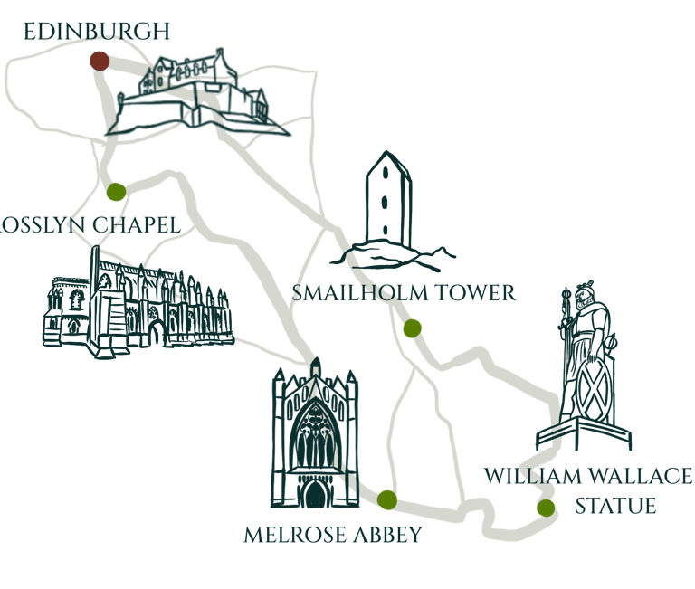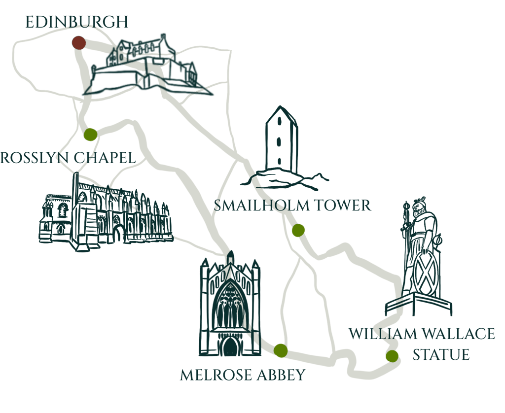 Our guide will then take you to a majestic Statue of William Wallace hidden in the forest. Built with local sandstone and overlooking the river Tweed, this iconic monument was commissioned by David Erskine in the 19th century and hidden to avoid the British rulers from finding it. It defiantly looks South, towards the English neighbour.